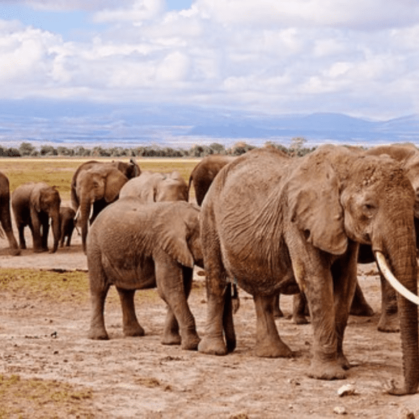 Amboseli National Park is famous for its large elephant herds, which can be seen moving across the savannahs with the iconic backdrop of Mount Kilimanjaro in the distance. The park is also home to many other animals such as lions, cheetahs, zebras, wildebeest, and giraffes.